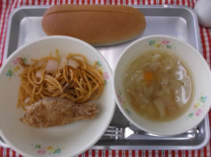 八王子ナポリタンサンド 白身魚の香り揚げ 野菜スープ 牛乳