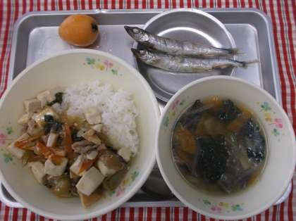 四川豆腐丼 ワンタンスープ 焼きししゃも くだもの(びわ) 牛乳