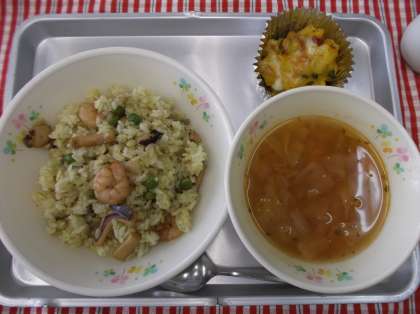 パエリア カラフル野菜のマヨネーズ焼き ミネストローネ 牛乳です。