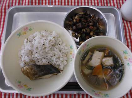 ごまごはん 鯵の一夜干し 大豆の磯煮 吉野汁 牛乳