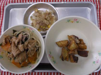こぎつねうどん 安倍川芋 ツナと大根のサラダ 牛乳