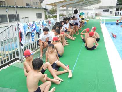 2学期が始まってから、天候が今一つの日が続いています。吹く風も、肌寒くなってきました。その中でも、子供たちは夏休みの水泳の成果を見せるべく、検定に取り組んでいました。検定後は自由練習の時間です。水泳指導も終わりになりつつあります。