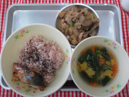 赤飯 さわらの西京焼き 新たけのこの煮物 お吸い物 牛乳