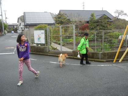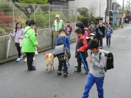 21日は雨上がりの朝でした。すっきりしない天気でしたが、子供たちは元気に登校してくれました。安全ボランティアの方のワンちゃんとも挨拶です。
