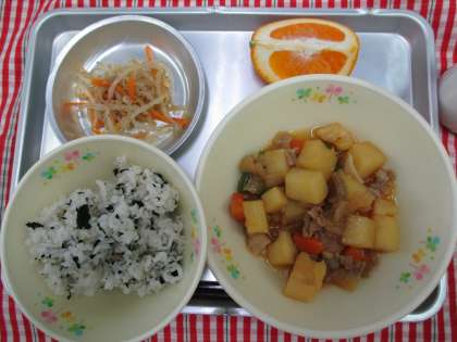梅若ごはん 韓国風肉じゃが もやしのナムル くだもの 牛乳