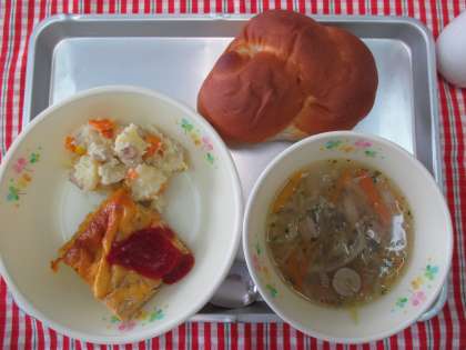パン オムレツ ポテトサラダ 野菜スープ 牛乳