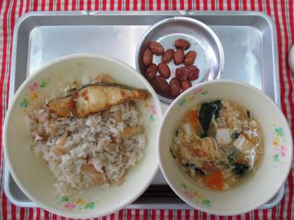 たけのこごはん 白身魚のカレー焼き かきたま汁 金時豆の甘煮 牛乳
