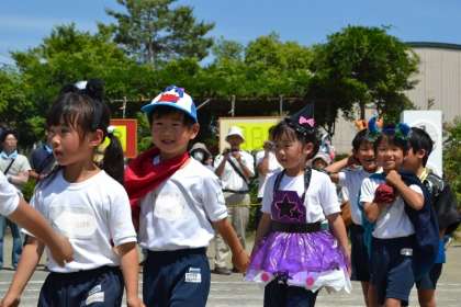 1年生の団体競技は玉入れです。しかし、出てくるのはかわいい妖怪たちでした。今、流行の「妖怪ウォッチ」にちなんだ「ようかい玉入れ」でした。