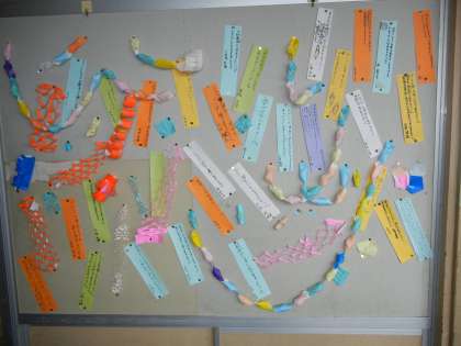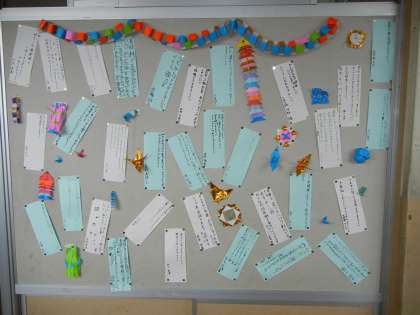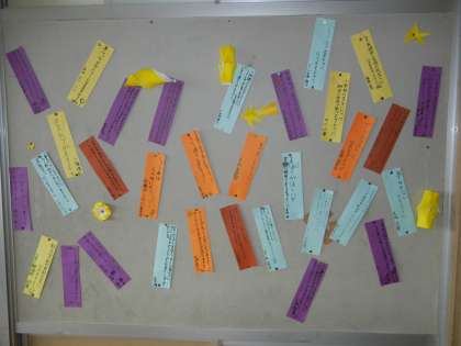 5年生の廊下掲示板には、願いを書いた短冊が貼られていました。家族の健康を気遣う優しい短冊や、中には担任の先生のダイエット成功を願う(笑)これまた優しい短冊もありました。