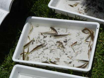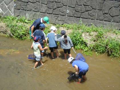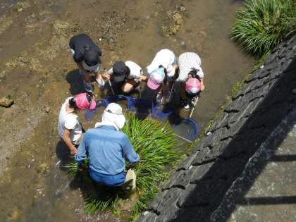 川から上がり、捕まえた生き物の説明を受けたり、観察したりしました。その後、川に放流しました。魚さんたちの協力にも感謝です。