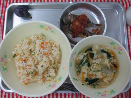 ガーリックピラフ 鯵のトマトソースかけ 野菜と卵のスープ プルーン 牛乳