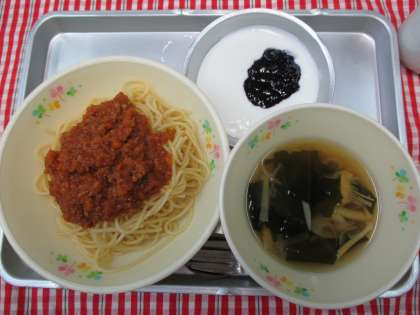 スパゲティミートソース わかめスープ ヨーグルトブルーベリーソース 牛乳