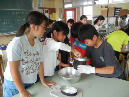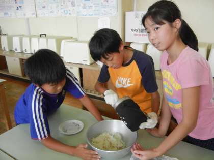 9月14日(月)、5年生が飯盒炊爨体験をしました。炊き上がったご飯をボールに分けています。