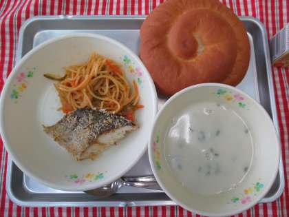 パン 白身魚の香草焼き スパゲティナポリタン ジャガイモポタージュ ジュース