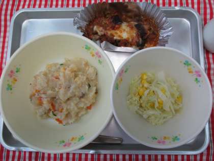 卵リゾット なすのグラタン コールスローサラダ 牛乳