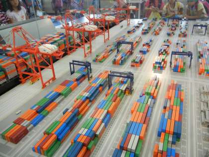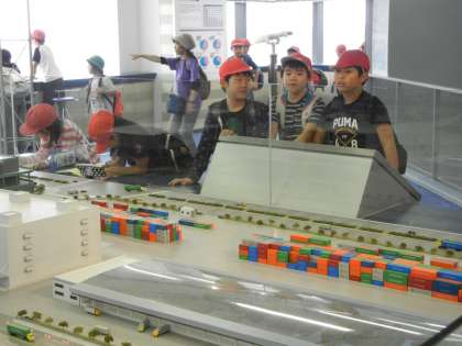 東京港の大型コンテナ模型もあり、子供たちは外の景色と見比べていました。