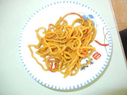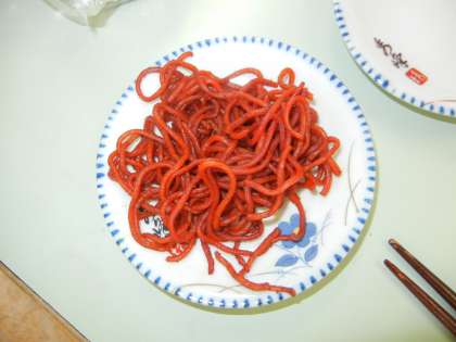 次に取り組んだのが、「色焼きそば」です。中華めんにカレー粉を混ぜると、麺が赤くなります。中華めんのかん水が、カレー粉のターメリックと反応して赤くなるそうです。