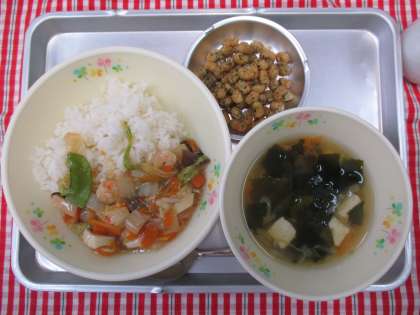 中華丼 わかめスープ ポップビーンズ 牛乳