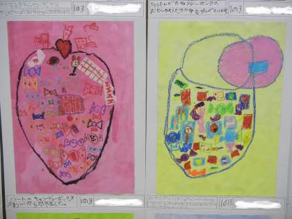 1年生の作品「ふしぎなキャンディボックス」です。いろいろな形をしたキャンディボックスがありますね。色もカラフルできれいです。