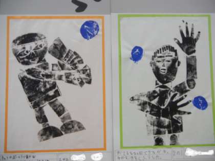 2年生の紙版画「うごけ! ぼく わたし」です。ピンポイントに色を使っています。