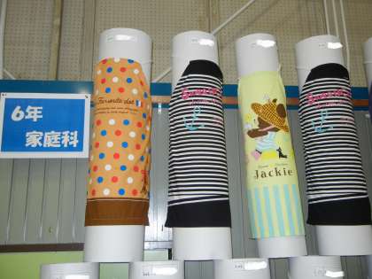 6年生の家庭科作品は「エプロン」です。6年生はミシンを使っての裁縫でした。
