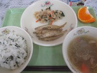 きびごはん 焼きししゃも いりどり 青菜のおひたし 牛乳
