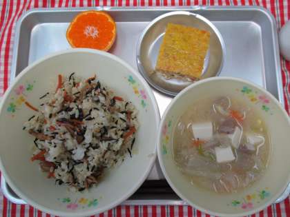 ひじきごはん あつやきたまご とんじる みかん 牛乳