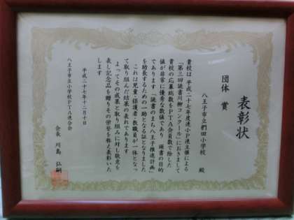 12月10日(木)、「第3回読書川柳コンクール」の表彰式がありました。椚田小は「団体賞」を受賞しました。皆様のご協力に深く感謝いたします。
