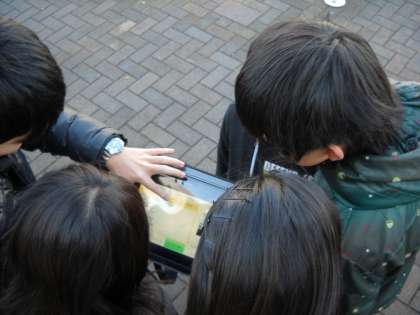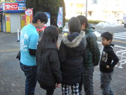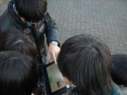 まだ、少し雪の残る道でしたが、チームワークよく調べて、タブレットに登録しています。写真はイトーヨーカドー方面の子供たちです。