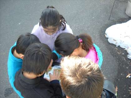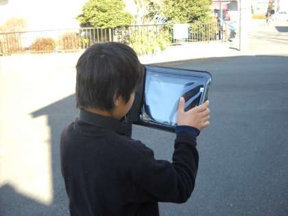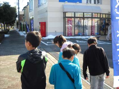 写真は学校近くの洋服屋さん周辺を調べるグループです。