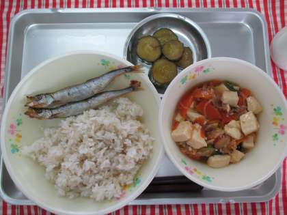 麦ごはん 焼きししゃも 肉豆腐 きゅうり南蛮 牛乳