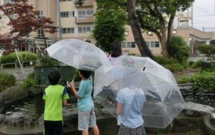 写真は、飼育委員の5年生がコイの世話をしているところです。