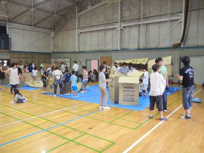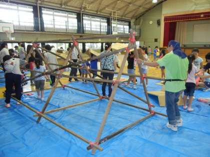 朝方は少し雨も残っていたので、体育館で段ボールハウスを作りました。まずは骨組みをしっかり固定します。