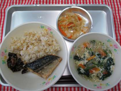 五穀ごはん 椎茸こんぶ 焼き魚(さば) むらくも汁 キャベツのピリ辛炒め 牛乳