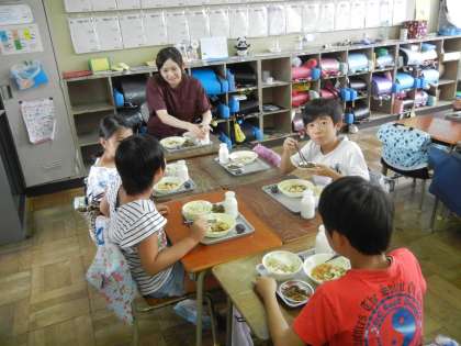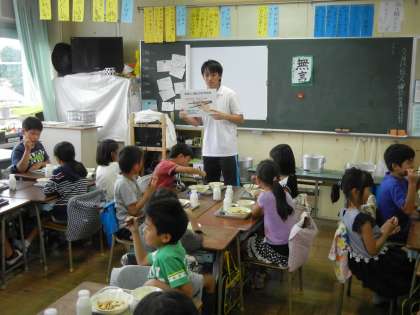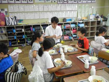 学生さんたちは、給食も一緒に食べてくれます。子供たちから、たくさん話しかけられて嬉しそうでした。