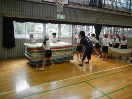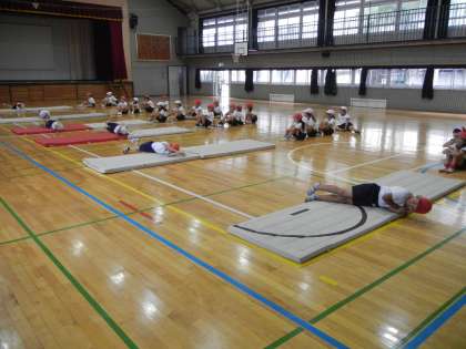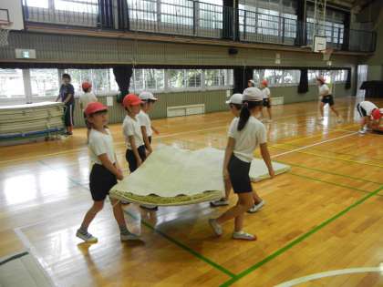体育館では、3年3組が「マット運動」をしていました。みんなで協力して、重いマットも運んでいます。チームワークがばっちりです。