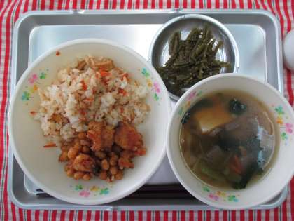 にんじんごはん ホキと大豆の揚げ煮 のっぺいじる 茎わかめの炒め煮 牛乳