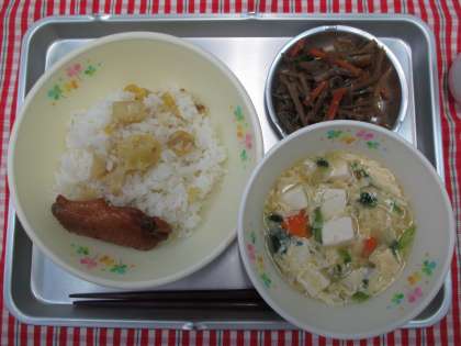 栗ごはん 鶏手羽の醤油に かきたま汁 きんぴら 牛乳