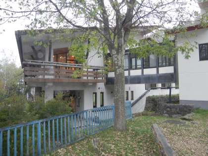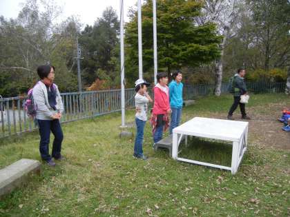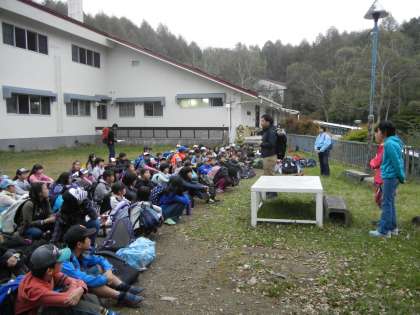 ハイキングも終わり、無事に姫木平の宿舎に到着しました。到着後、開校式をしました。宿舎の方も外で出迎えてくださいました。