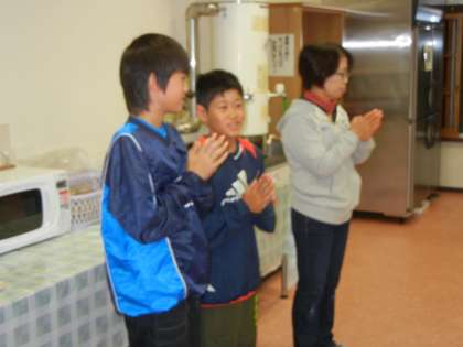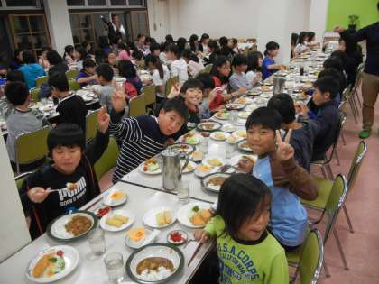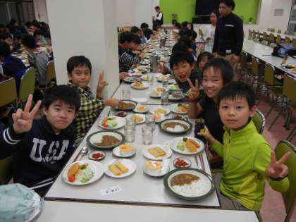 宿舎での初めての食事です。食事係はとても上手に配膳してくれました。みんなで声を合わせて「いただきます」をします。