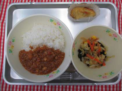 チリコンカンライス 和風サラダ アップルポテト 牛乳