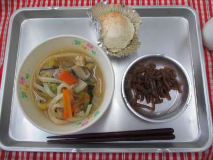 みそ煮込みうどん 酒まんじゅう こんにゃくピリ辛いため 牛乳