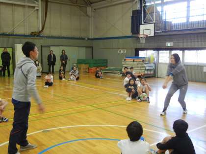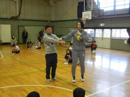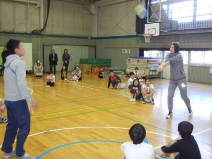 体ほぐしの運動、ボール慣れの後、まずはレシーブの基本を教えてくださいました。膝を上手に使ってレシーブするコツなど、わかりやすく教えていただき、先生方も勉強になりました。