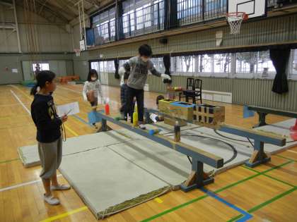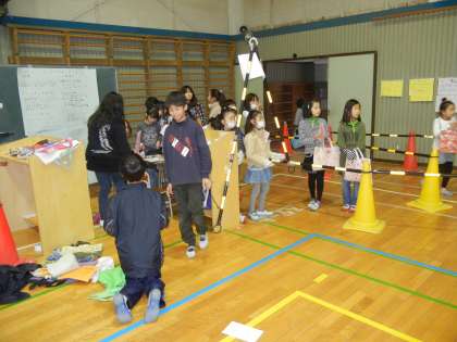 5年3組は、体育館で「サスケ」というお店を開いていました。テレビでおなじみのないようです。様々な障害をクリアしながら、ゴールを目指します。