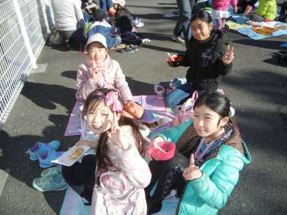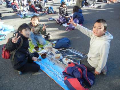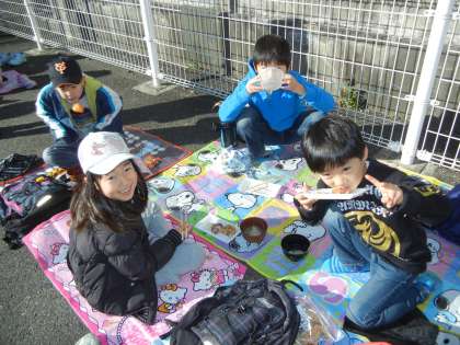 9時前には、子供たちが集まり始め、開始時間には、大勢の子供たちが集まりました。東門の駐車場には、子供たちがシートを敷いて、お餅と手作りスープを美味しそうに食べていました。