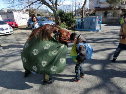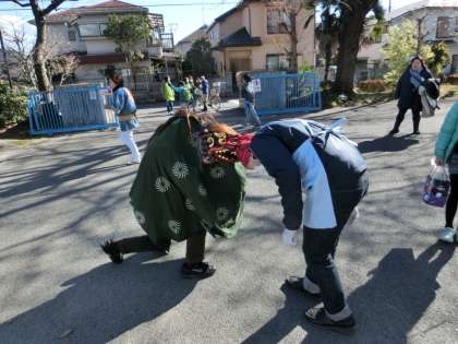 獅子舞に頭をかんでもらい、無病息災を願います。先生もご利益にあずかろうと、頭をかんでもらっていました。