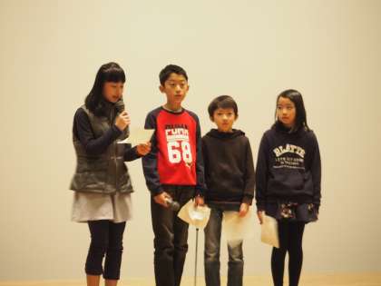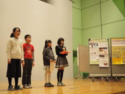 2月4日(土)、北野のあったかホールで、エコ広場の環境学習発表会がありました。一年間、環境学習を続けてきた4年生代表の子供たちが、学習の成果を発表してきました。写真は1組の子供たちです。