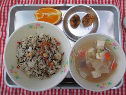 ひじきごはん かりかりがんも 豚汁 果物(オレンジ) 牛乳