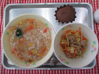 野菜リゾット 豚しゃぶサラダ チョコカップケーキ 牛乳