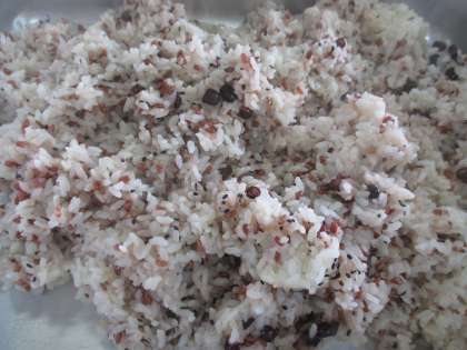 お赤飯・・・北海道のお赤飯は、食紅を入れて炊いたもち米に金時豆の甘納豆を混ぜてあり、甘味があります。
